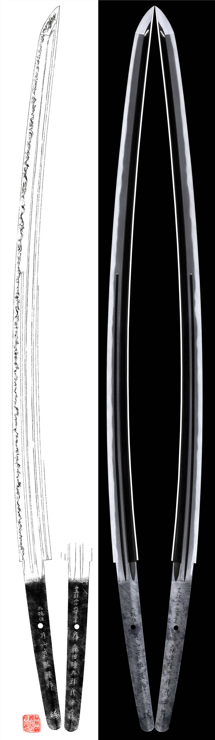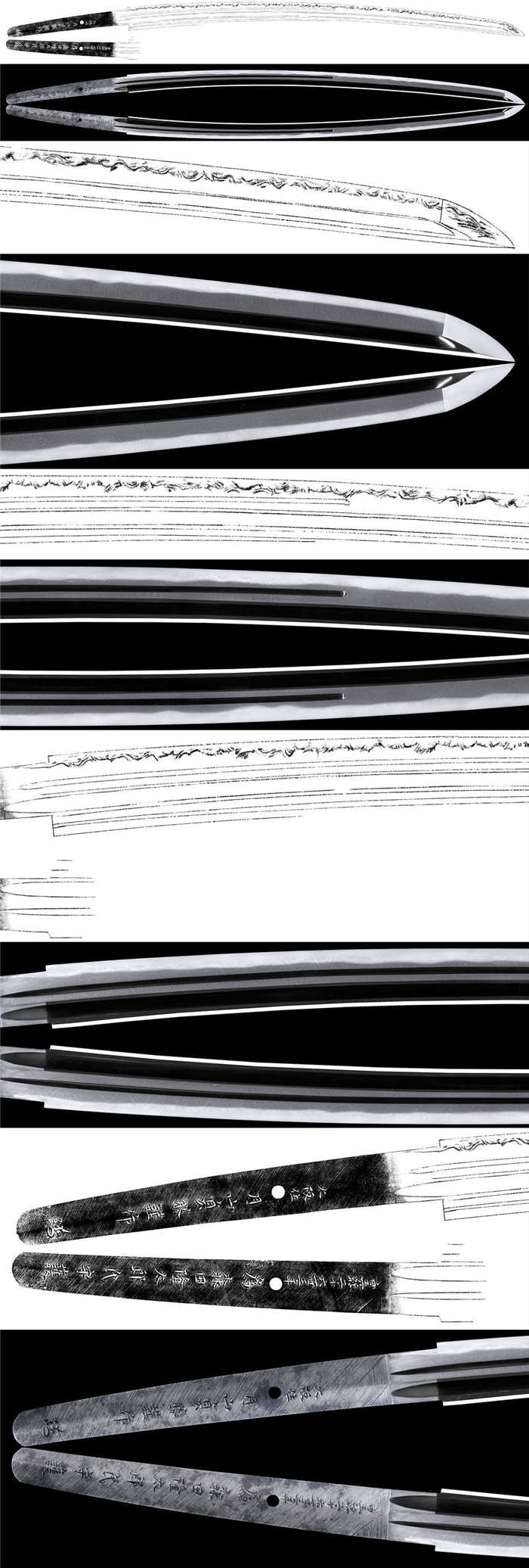 体配:身幅宽,元重厚,三之栋造,表里雕刻棒樋和添樋,反深,切先长,刀姿优良的作品。