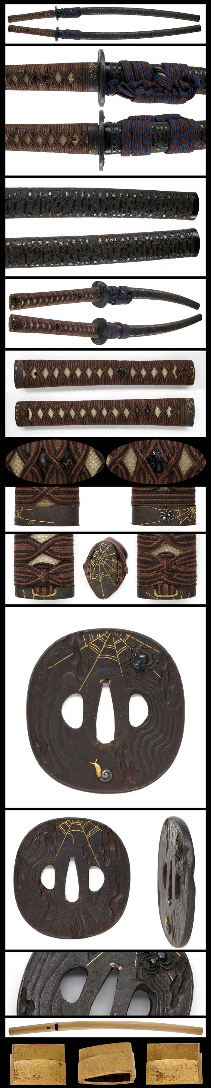 鍔:楕円形の鉄鍔に赤銅で蜘蛛を糸を金で描く