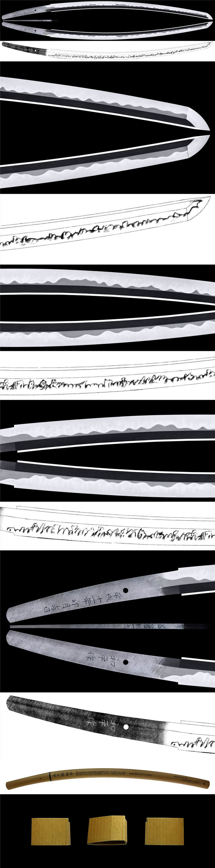 刃文:气出来风,丁字乱混重华丁子乱,足、叶盛入,刃中砂流、金筋动,帽子乱込。