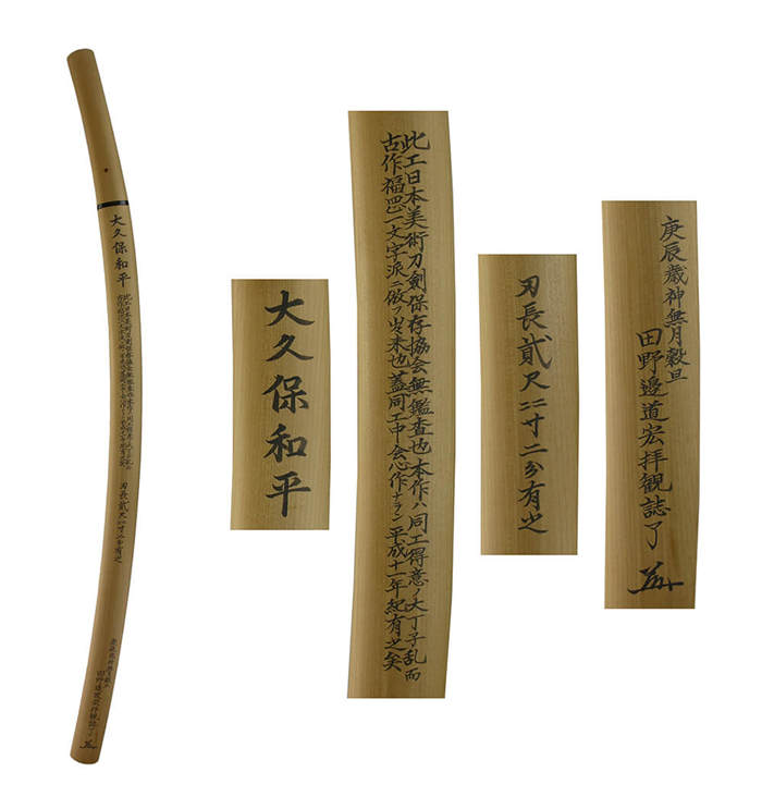 鞘書:田野辺先生 大久保和平 此工日本美術刀剣保存協会無鑑査也