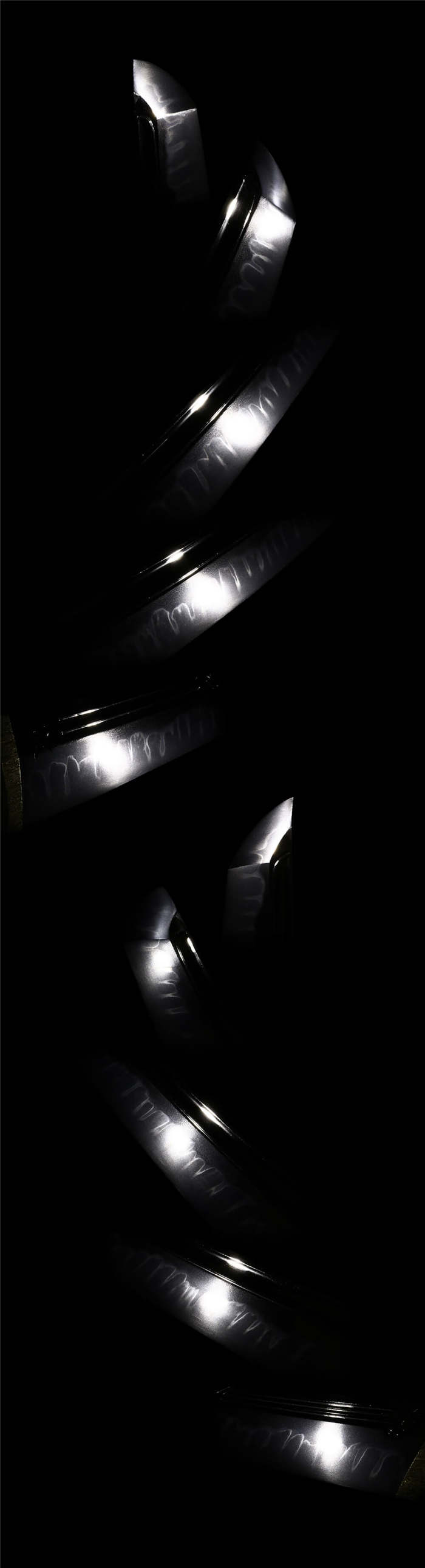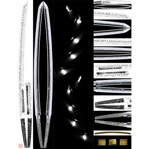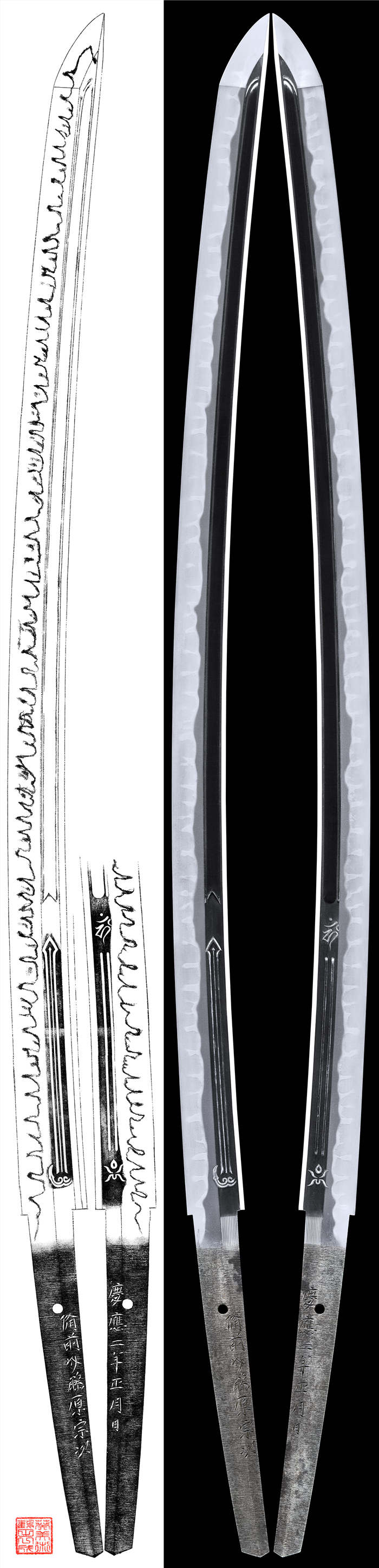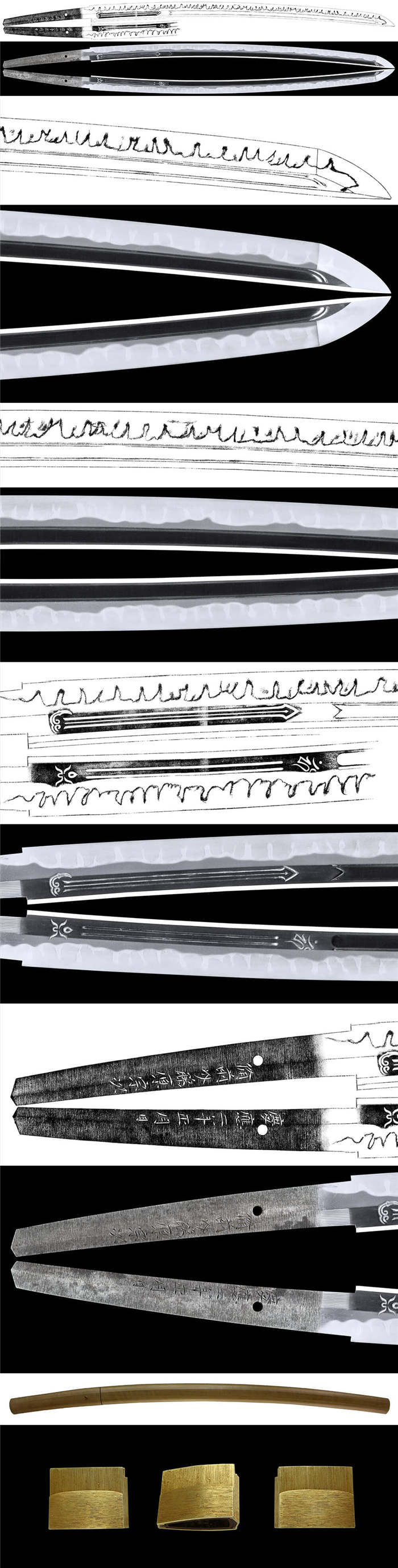 体配:身幅宽、元重厚,反适度,大切先,刀姿豪壮。表雕刻素剑和棒樋、添樋,里雕刻护摩箸、梵字。
