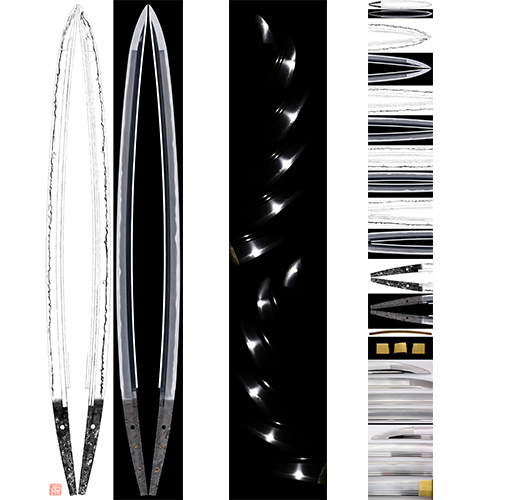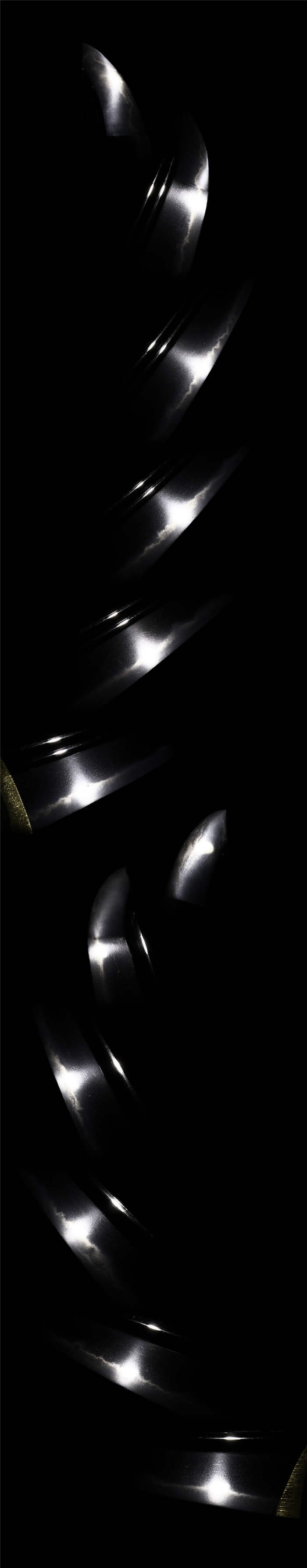刃文:沸出来直刃加湾,混互目乱,气口深,刃中砂流、金筋动,带有极强的相州传风格,帽子尖带扫。