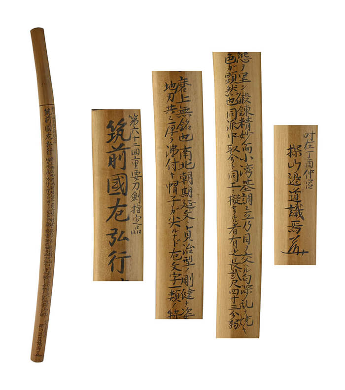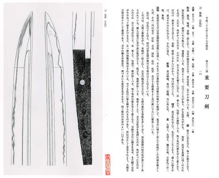 筑前国左弘行 磨上無銘也 南北朝期延文・貞治型ノ剛健ナ姿態ヲ呈シ鍛錬精妙而小湾基調ニ互乃目ヲ交ヘル匂深ノ乱ヲ焼キ
