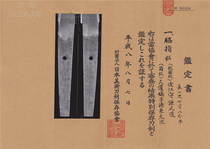 宽文1年受领近江大掾一职,此后转任近江守,逝世于正德元年,享年85岁。作品多在刀茎上切菊纹和枝菊纹,本作是其与嫡子源久次的合作刀。