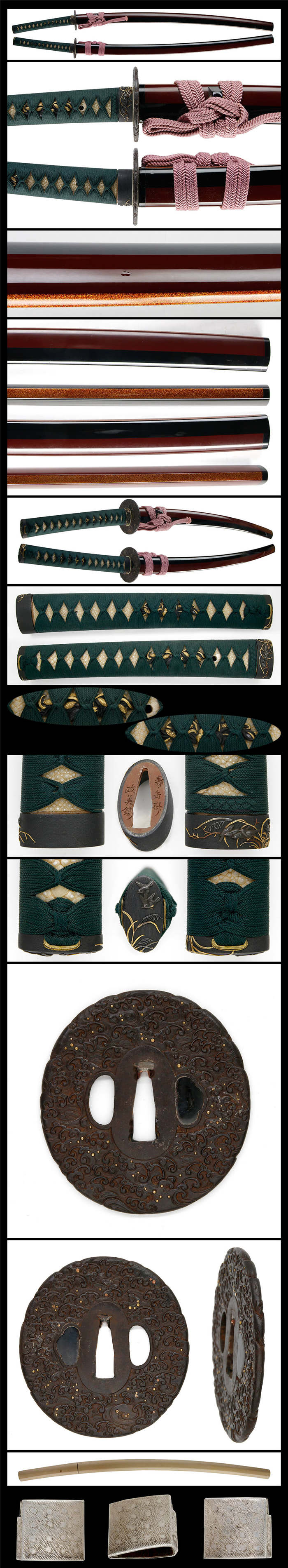 鞘:黒と小豆色の鞘に上下には金梨地をほどこし洒落た図柄の鞘