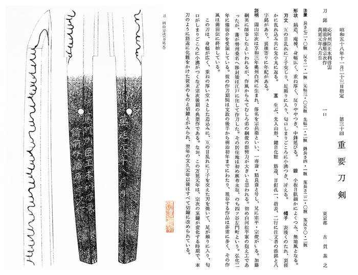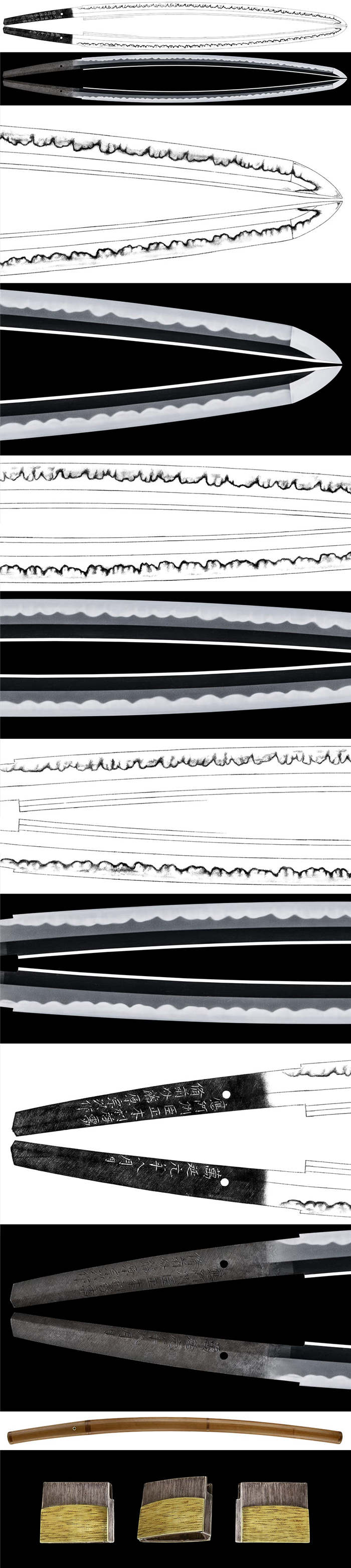 介绍:宗次时奥州白河固山宗平之弟,跟随加藤纲英学习锻刀技术,称固山宗兵卫,后前往江户成为桑名藩的刀工。住在麻布的赤坂四谷左門町,向山田浅右卫门学习,因此他的很多刀作都有山田浅右卫门的裁断铭。弘化2年受领备前介一职,至明治时期一直在锻刀。本作是其受领备前介之后安定对齐的作品,身幅款,元重厚,刀姿康健。