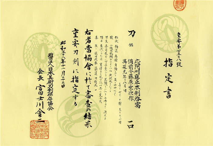 葵美術より一言:興味をそそられるのは本作の注文者は正木家七代を引き続いだ正木又太郎利敬と称し御刀番役をしていた
