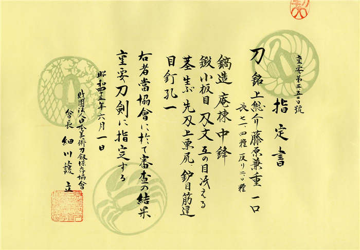 葵美術評価鑑定書:保存刀剣鑑定書