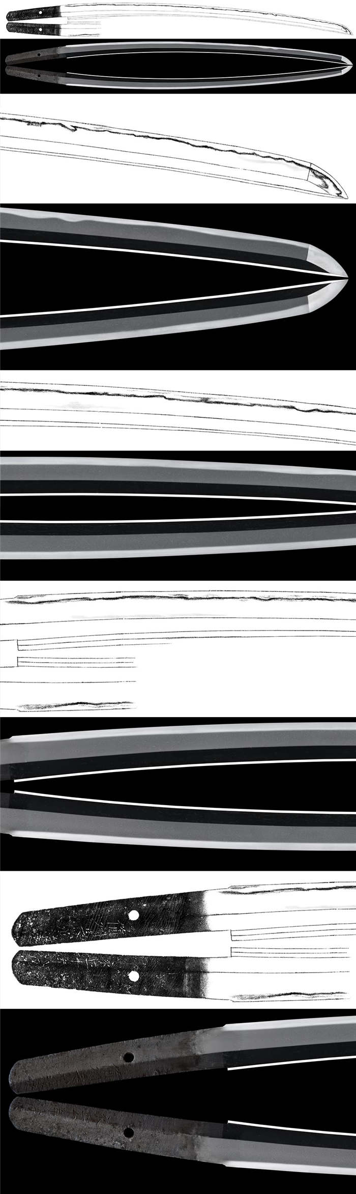 刃紋:錵出来直刃、匂口柔らかく小足が入り品格のある刃紋で帽子は丸く返る。
