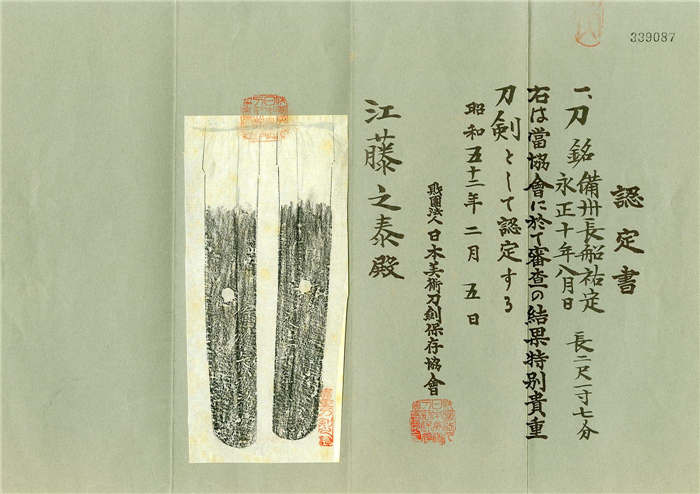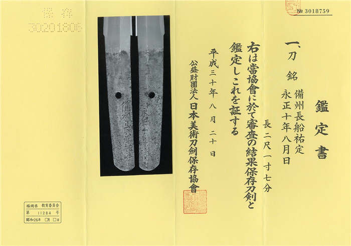 葵美术正真鉴定书:保存刀剑鉴定书(特別贵重刀剑、特別貴重刀装具)全身押形
