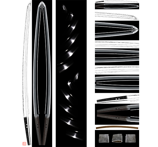 葵美術より一言:来一派の中島来の作品で肉置きが良く大切先となり体配の良い作品です。上研磨がほどこされとくに地金が良く練れて刃紋も刃中の働きが横溢で見事といえる作品です。特別保存は既に取得済みです。本作は瑕が無く(誉れ瑕は除く)健全な作品で地金が美しく刃紋も魅力のある作品といえます。