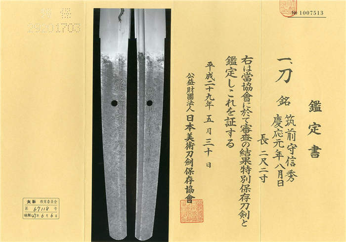 特徴:筑前守信秀は武蔵の刀工。文化十二年(1815)に越後で生まれ、