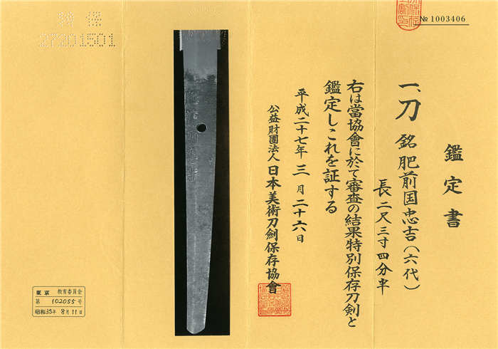 特徴:肥前国近江守忠吉(六代)は元文元年(1736)に生まれ、父が生存中は忠広と銘じたが父没後は忠吉と改め橋本新左衛門と称す。
