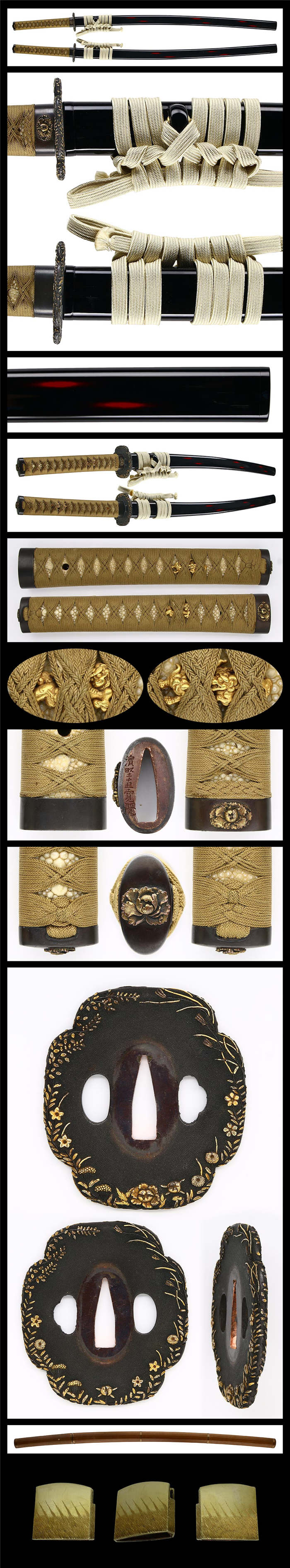 鍔:木爪型赤銅魚魚子地に廻りを菊、牡丹、薄、藤などの花を高彫りし金の色絵をほどこす。
