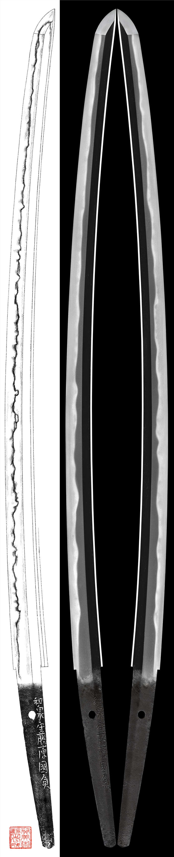 葵美術より一言:和泉守藤原国貞は数多くの名作を製作したが老齢になってからは息子の真改が父親の為に晩年は代作を行ったと言われております。