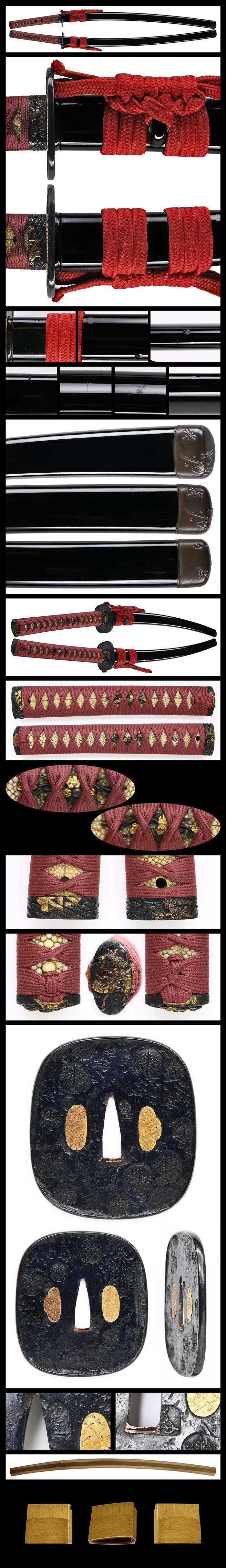 鍔:赤銅地に耳を立ち上げ家紋を造る。 数打後藤一乗に似る。