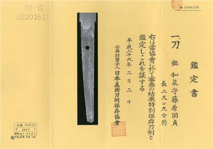 刀:白鞘入、拵付(特別保存刀剑鉴定书)