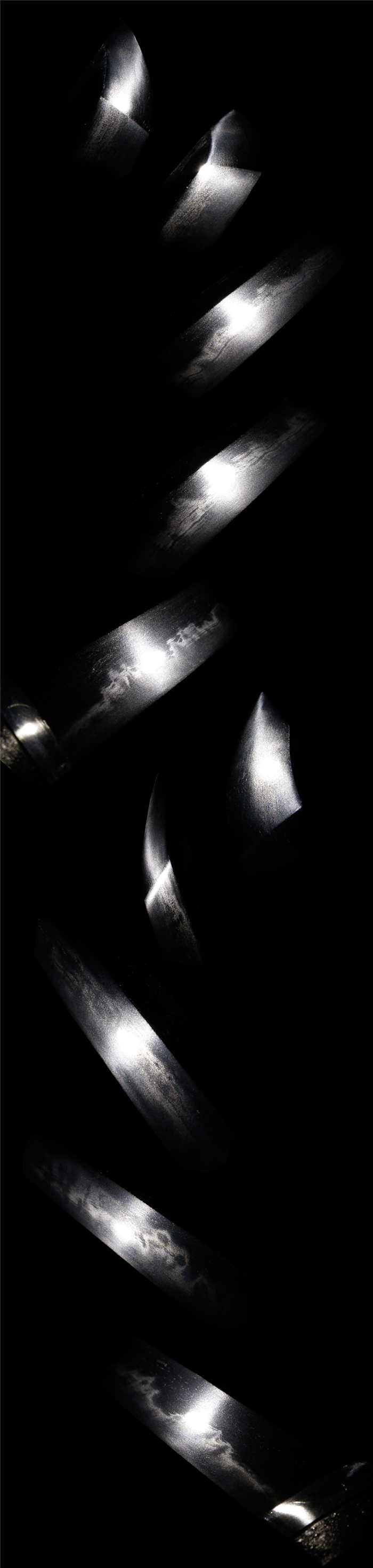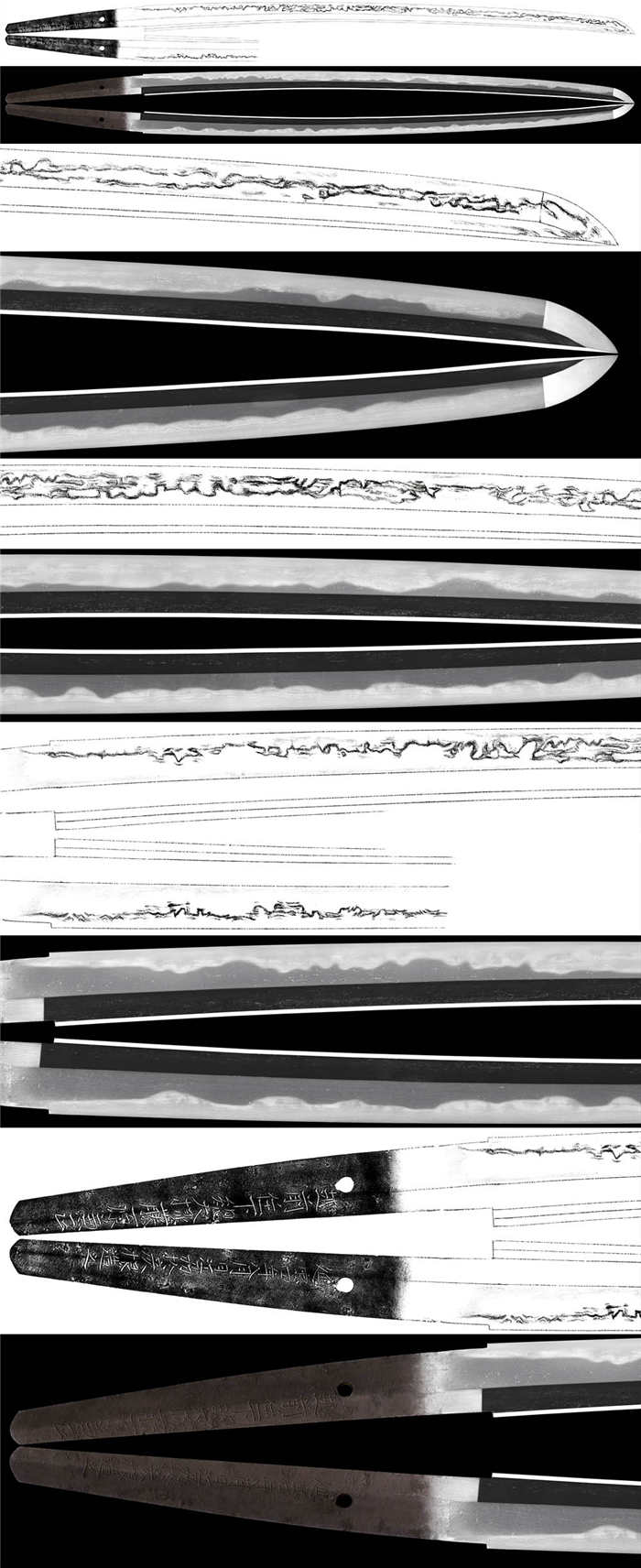 刃文:沸出来,气口深,刃中砂流、金筋盛动,加二重刃,刃缘柔和,帽子乱込。