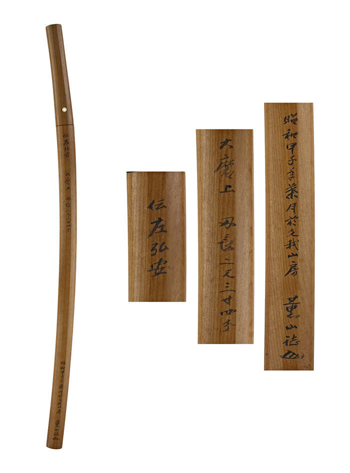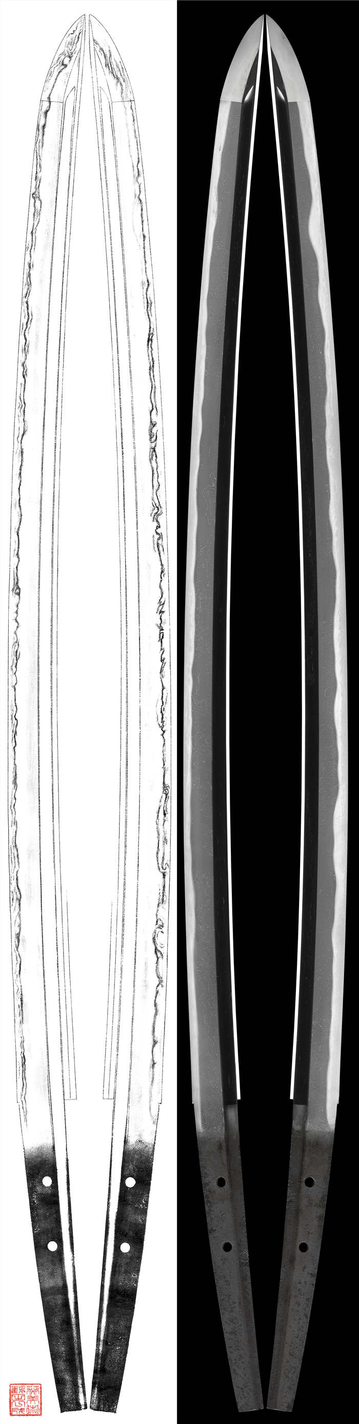 体配:身幅、重ねしっかりとした作品で反り適度に付き大切先の体配となり表裏に棒樋を掻き通す。