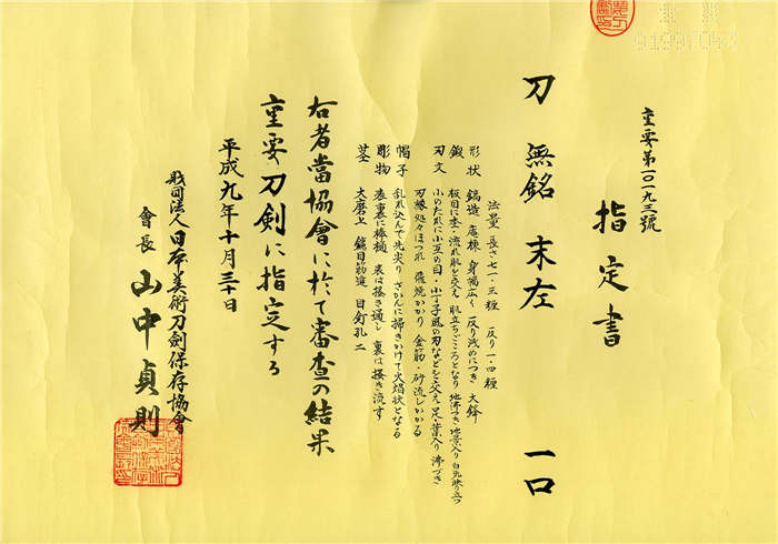 本作は地鉄は板目に流れ肌を交え地錵が付き刃紋は小のたれに小互の目乱れを交え錵付き、金筋、砂流がかかり帽子は先が尖り盛んに掃掛て火焔風となるなど末左の典型的な作風を明示している。