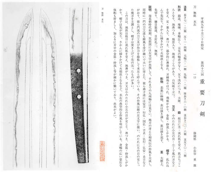 特徴:南北朝時代初期筑前国には左文字が出現してそれ迄には見ない地刃の冴えた相州伝の作風を大成し同時にこの一門の刀工達も師風を受け継ぎ大いに栄えた。