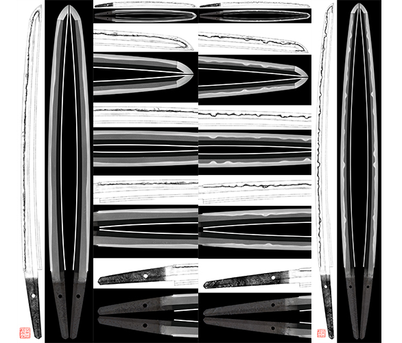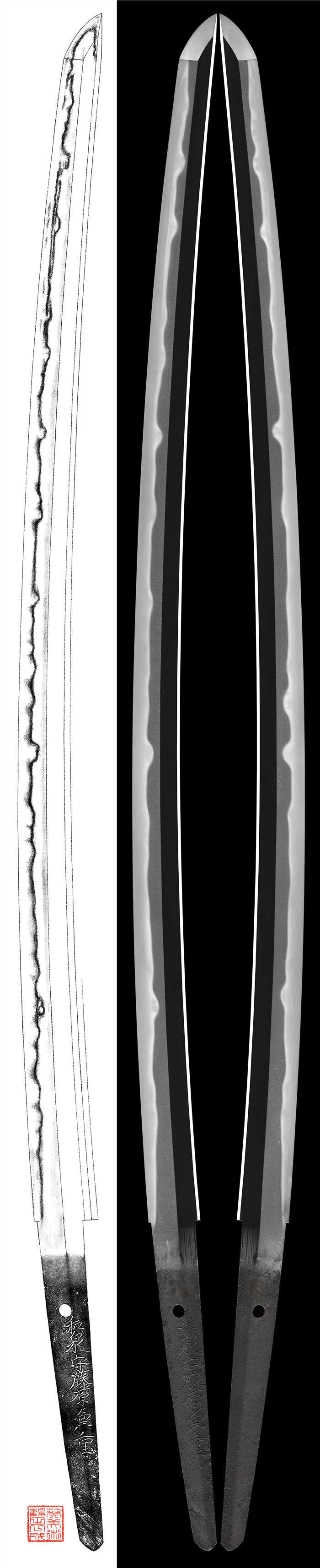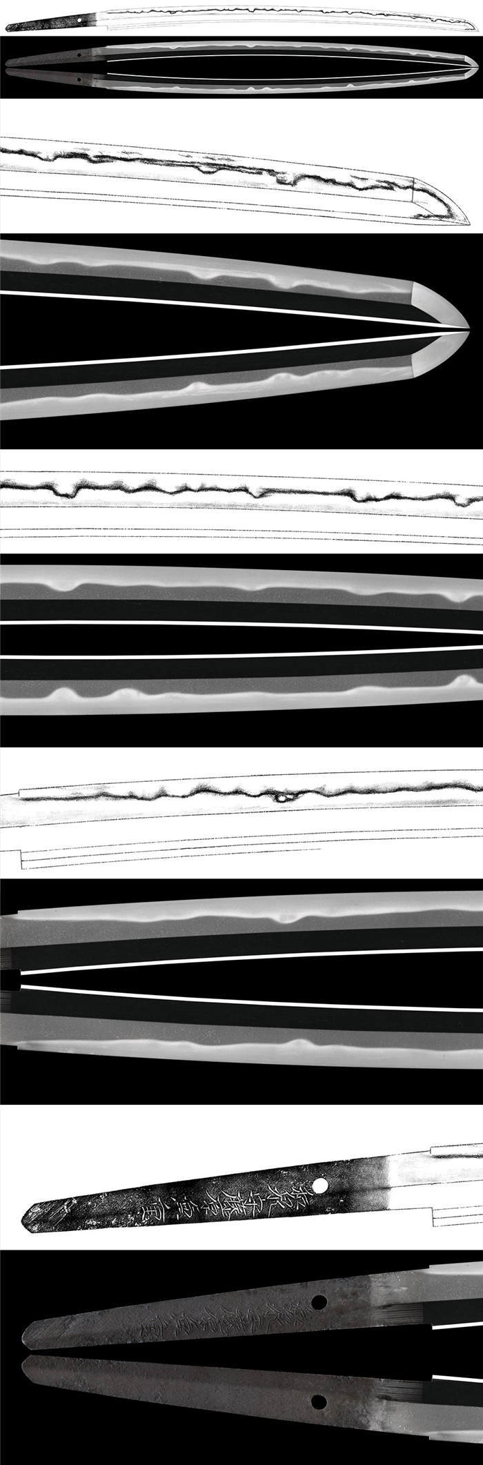 刃紋:錵出来刃区より直刃、その先のたれに互の目乱れが続き高低に変化があり刃中に砂流、細かな金筋が入り明るく冴える。