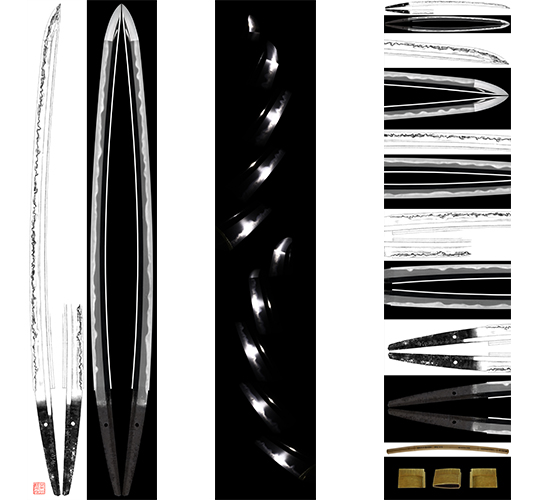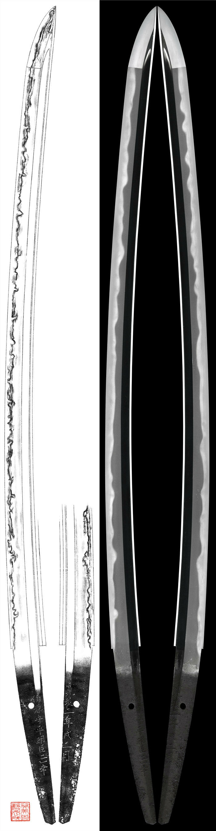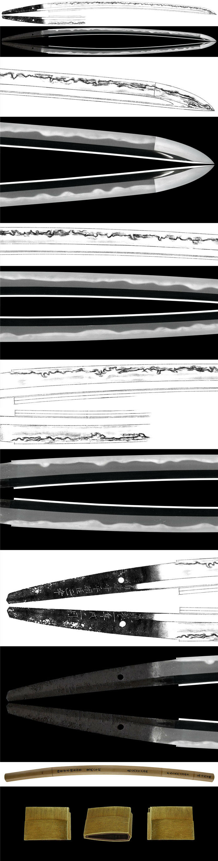 体配:身幅が広く重ね厚く反りが深く付き表裏に棒樋を彫り大切先の豪快なすがたをした作品。
