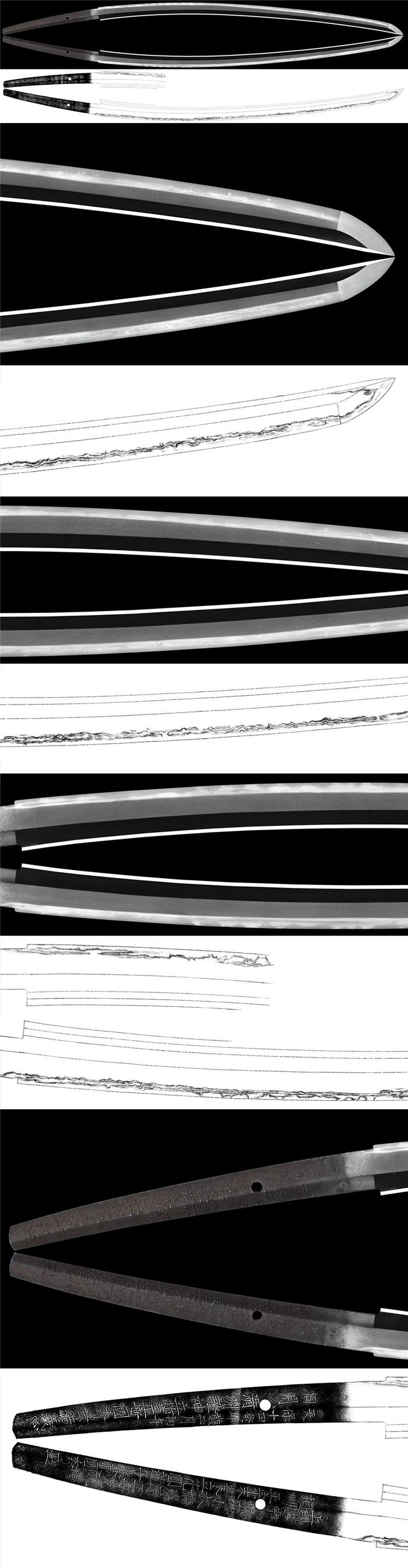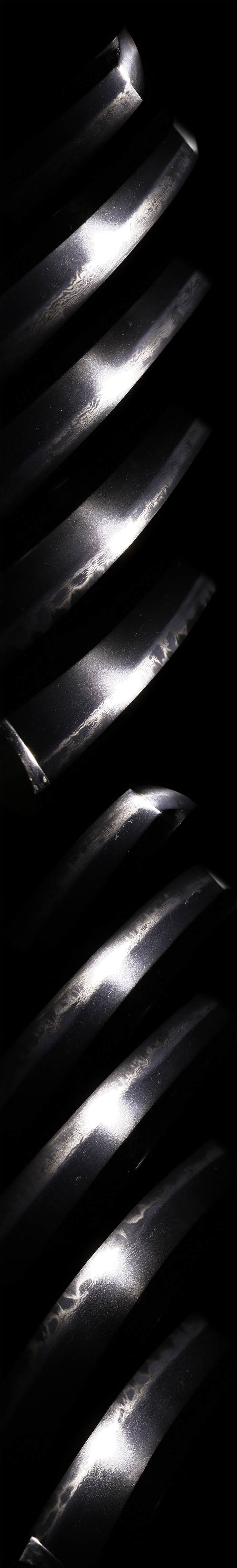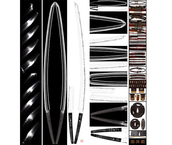 刃紋:錵出来直刃を基調として互の目乱れが入り、刃中、砂流、特に金筋が盛んに働く覇気のある作品となる。