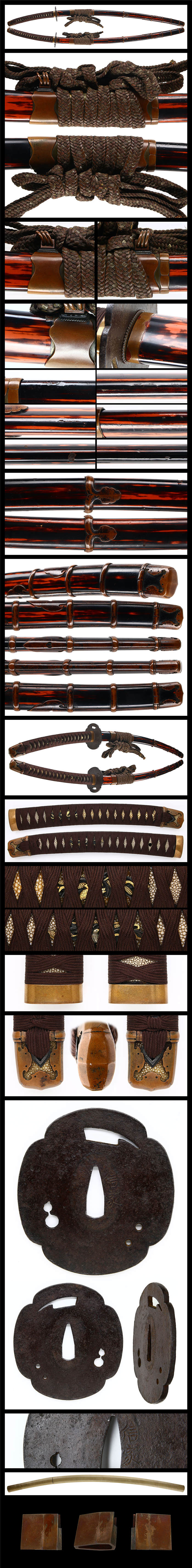 鍔:大振りの木爪型鉄鍔に瓢箪、鉈等を透かし耳を少し立ち上げる.信家と銘がある。
