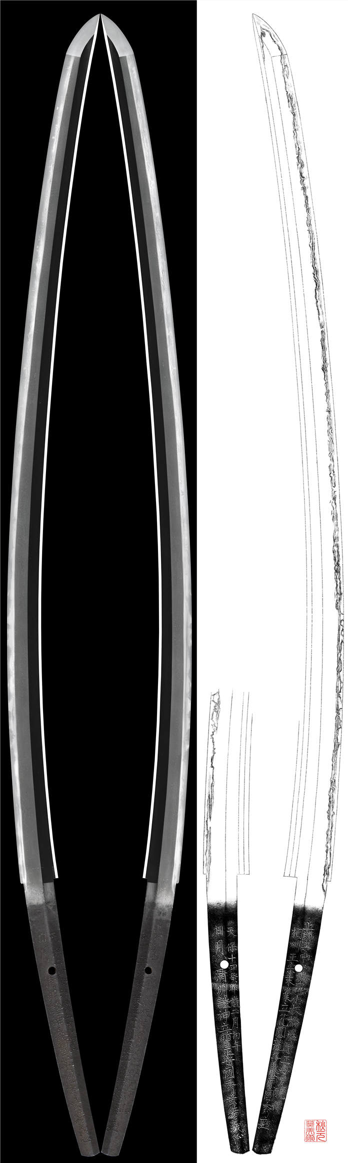 特徴:相州正宗末葉立花員龍子国秀は江戸中山義弘の門人で安中の藩工で本作は天保14年(みずのとう)2月2日に国秀のに技量が完全に出来た事を神に誓い上州安中城の知人の小坂橋藤原生安氏を祝い相州末葉である立花員龍子藤原国秀がこの作品を製作したと意味すると考えられます。