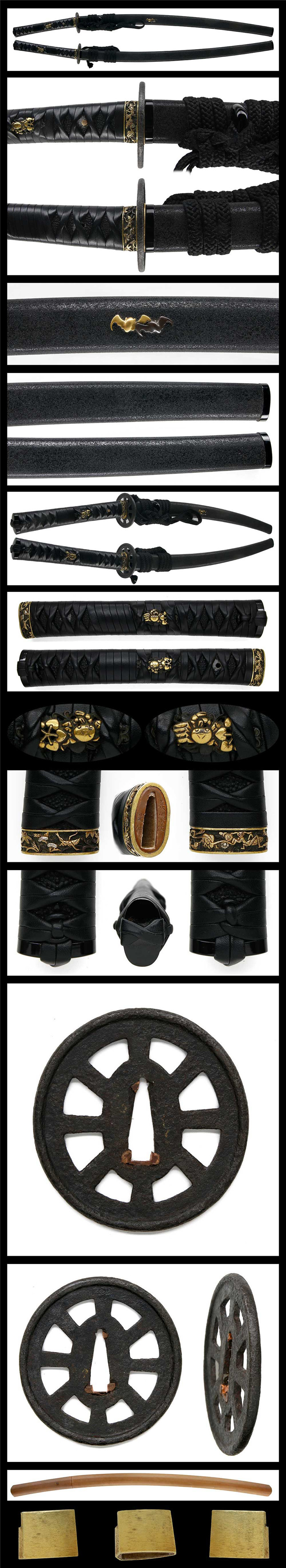 ご注文番号:19727刀:白鞘入り、拵え付き(特別保存刀剣)銘:(菊紋)一備前長船住横山加賀介藤原祐永天保九年二月日新々刀:上作:備前当社では刀工の出来によって最上作、上々作、上作、普通作を記載しております。本作の出来は横山加賀介藤原祐永としては上々作にランクされる作品です。研磨済みはばき:金着一重刃長:2尺2寸9分(69.39センチ)反り:7分5厘(2.27センチ)目釘穴:1個元幅:3.13センチ先幅:2.15センチ重ね:0.69センチ時代:江戸時代末期体配:身幅が広く重ね厚く反り深く切先が延びた体配の良い姿をした作品。地鉄:小板目肌よく詰んで地錵が付き綺麗な澄んだ地金となる。刃紋:刃区より匂出来直刃、その先華やかな丁字乱れを焼き足よく入り匂口柔らかく重華丁字となり高低に変化があり刃中、葉が働き帽子丸く返る。特徴:横山加賀介藤原祐永は備前の刀工で祐平の次男でその後、家督を相続した。当時は浜部一派が匂口の締まった富士見西行や菊花丁字乱れを焼いたがそのご加賀介藤原祐永は同様な作品を制作する様になった。異なるのは、出来が一文字を写した作品が多く華やかな作品は浜部一派の作品の出来を上回りその作風は弟子に伝えられて独特な作風を制作している。銘には友成五十六代孫と刻む作品も多く嘉 永4年に、57歳にて没している二代祐永は友成五十七代孫と称しその弟子は横山祐包が引き継ぎ友成五十八代孫と銘を切る。本作は華やかな丁字乱れを焼き上げ一文字を写して成功している。拵:鍔:鉄地の車透かし鍔。縁頭:頭は角、縁は赤銅に秋草虫の図を高彫りし、金の色絵をほどこす。美野住光沖と銘がある。鞘:石目地、黒塗り鞘に蝙蝠。目貫:赤銅に蟹の図を高彫りし、金の色絵をほどこす。葵美術より一言:横山加賀介藤原祐永は独特な丁字乱れの作風を考案した刀工であります。本作はやや趣きが異なりより一文字風の雰囲気があり匂口が深く、刃紋は締まり加減にコントラストを付けて明るく冴えて祐永の最高傑作に近い出来をしております。華やかな刃紋は気分的にも明るい気分になれる見事な作品で是非皆様にお薦めしたい作品です。特別保存刀剣鑑定書葵美術評価鑑定書:全身押し形