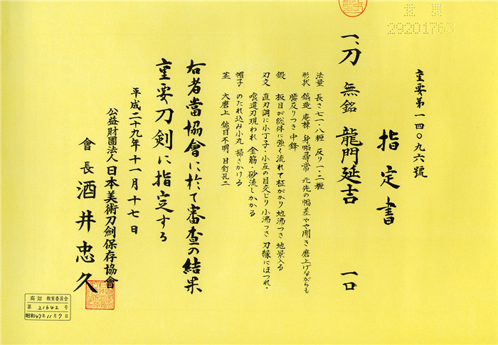 商品名称:刀:無銘(龍門延吉) (第63回重要刀剣)