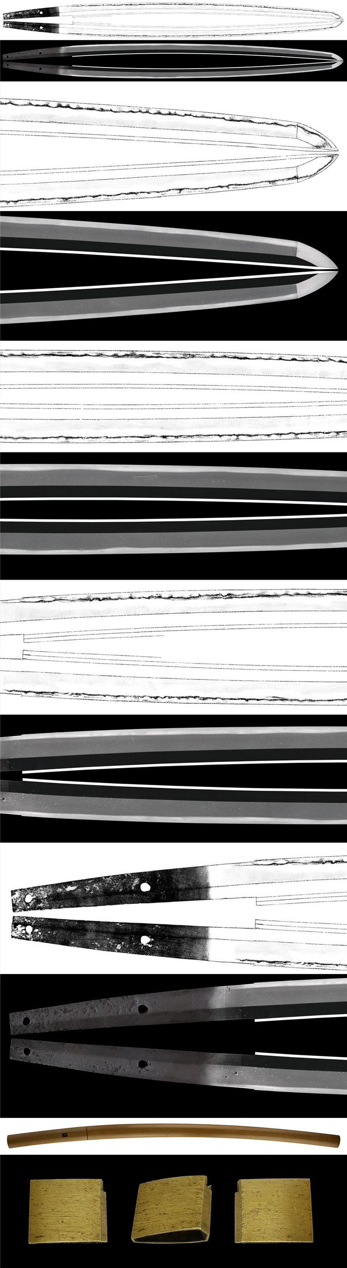 ご注文番号:19698刀:白鞘入り (第63回重要刀剣)(委託品)銘:無銘(龍門延吉)古刀:上々作:大和 当社では刀工の出来によって最上作、上々作、上作、普通作を記載しております本作の出来は無銘(龍門延吉)としては最上作にランクされる作品です。研磨済みはばき:金着一重刃長:71.7センチ反り:2.8センチ目釘穴2:個元幅:2.88センチ先幅:1.93センチ重ね:0.61センチ刀身重量:715グラム時代:鎌倉時代永仁の頃 1293年から1298年(727年前)体配:大摺上無銘で身幅、重ね尋常な反りの適度に付き帽子が延びた体配の良い姿をした作品です。地鉄:小板目肌に柾目が良く流れ詰んで地錵が付き、地景が入り淡い映りが見て取れる鎬地:小板目肌に柾目が見て取れる。刃紋:錵出来匂口深く中直刃に小足が盛んに働き砂流、金筋が良く働く特徴:龍門延吉は大和系の刀工で大和千手院の流れと言われている。鎌倉時代の大和系統の刀は地金が極めて良く、手掻包永の様な抜群の詰んだ地金となります。本作の地金は一見すると手掻包永とも思える最良の地金で、誠に品格のある作品です 特に刃中の働きが優れ来一派を思わせる。是非御薦めしたい見事な作品です。葵美術より一言:本作は龍門延吉と個銘まで認めた作品でどっしりとして健全な作品であります。差裏のハバキ元近辺に朽ち込みがり更に物打ち近辺に済み籠りが見てとれますが問題はありません。龍門は千手院の流れを汲んだ刀工と言われ刃はあ明るく冴え板目に柾目が流れ帽子は掃掛た見事な作品んで特に刃中の働きが横溢であります。第63回重要刀剣葵美術評価鑑定書:全身押し形