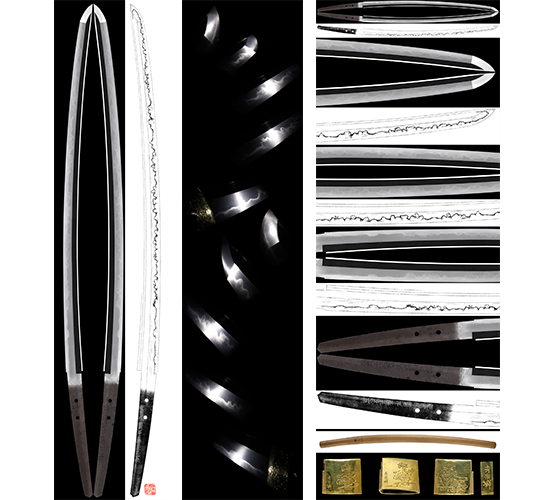 ご注文番号:19712刀:白鞘入り(特別保存刀剣)銘:肥前国河内守藤原正廣(2代)新刀:上作:肥前当社では刀工の出来によって最上作、上々作、上作、普通作を記載しております本作の出来は肥前国河内守藤原正廣としては最上々作にランクされる作品です。上研磨済みハバキ:金着一重はばきに牡丹の図柄を彫る。 作者:秀宗 刃長:69.4センチ反り:1.9センチ目釘穴:1個元幅:3.19センチ先幅:2.09センチ重ね:0.66センチ時代:江戸時代寛文の頃体配:多少の区送があるが身幅が広く重ね厚く反りが深く切先が延びた体配のよい作品です。地鉄:小板目肌に小杢目肌があ混じり地錵が良く付き綺麗な精良な肥前の小糠肌となる。刃紋:刃区よりのたれでその先匂口の深い互の目乱れとなり刃中、砂流、金筋が働く帽子匂口の深い丸く返る。特徴:肥前河内守正広は、初代肥前国忠吉の系統にあたり名は橋本弥七郎と称する。初代正広の長男で初銘を正永と切り、初代正広没後、寛文五年に河内守正広と改名している。初銘を肥前国武蔵守藤原正永、次に肥州佐賀住藤原正広、肥前国河内守藤氏正広、肥前国河内守藤原正広などと切る。元禄12年、73歳で歿している出来は匂口の深い直刃、互の目乱れ、大互の目乱れとなり他の肥前刀とは趣きが異なる。夏の積乱雲を思わせる作品は圧倒されます。 本作は、中直刃出来の素晴らしい作品で状態も良く瑕欠点のない作品です。葵美術より一言:昨今良質な作品が市場から消えてしまった感がございます。本作は二代内守藤原正廣です。以前ですと重要刀剣にも合格出来る作品でしたかが最近の審査は難しくと考えますが、出来は問題なく傑作といって良い左悪品です。 特に夏雲のもくもくした積乱雲にも例えられ匂口の深さや刃中の働きが横溢であります。私見ではこの初代二代の正広は新刀上々作にランクされてもおかしくないのですが上作に留まっております。 この様な夏雲に浮かぶ積乱雲の様な刃紋の作成は極めて難しく相当な高技量であったと考えられます。是非お求めになられます事をお勧め致します。特別保存刀剣鑑定書 葵美術評価鑑定書:全身押し形
