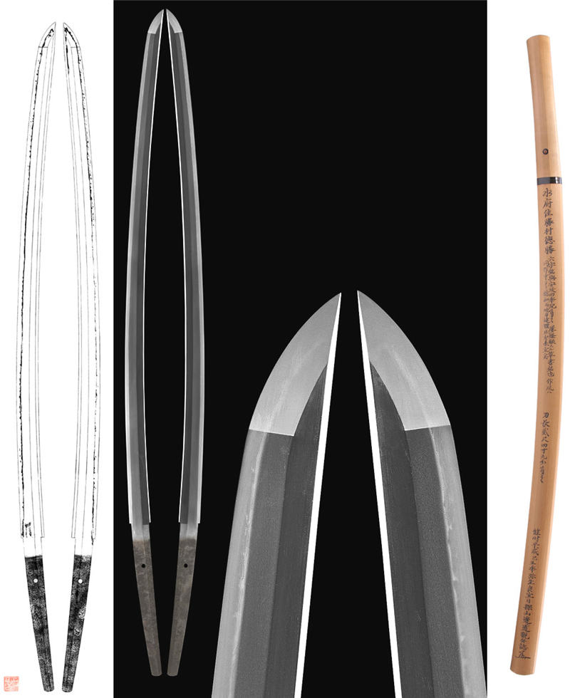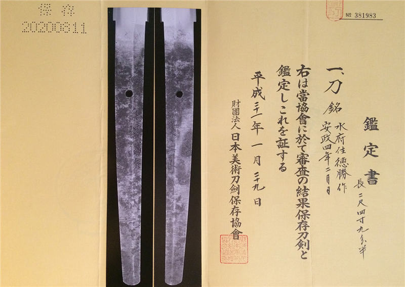 鞘书:水府住勝村徳勝作 六字銘興安政四季紀有之 屡経眼スル草書銘也 作風ハ 同作中ニアリ穏和而地刃健體 且出来宜矣 刃長貮尺四寸九分有之