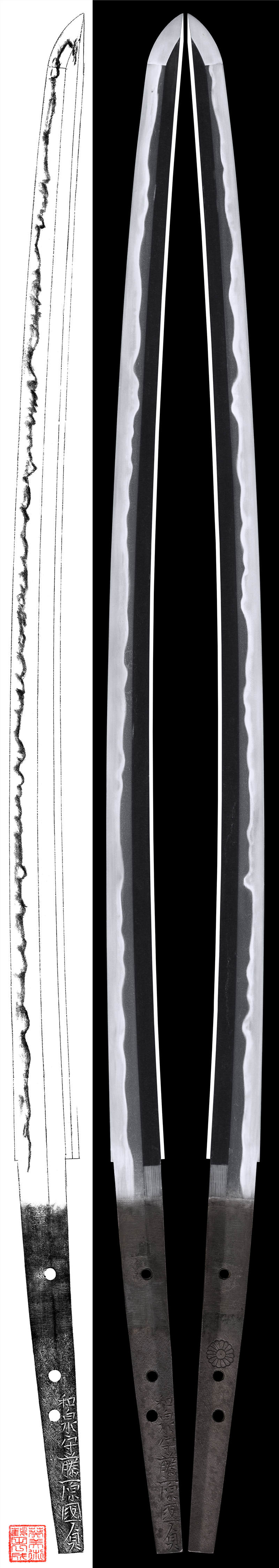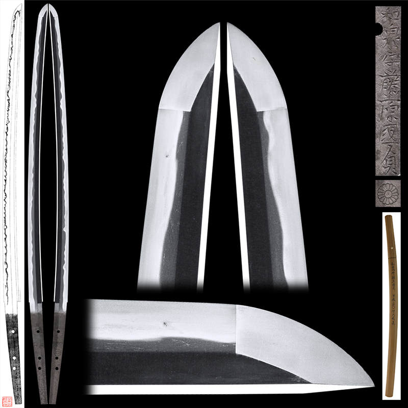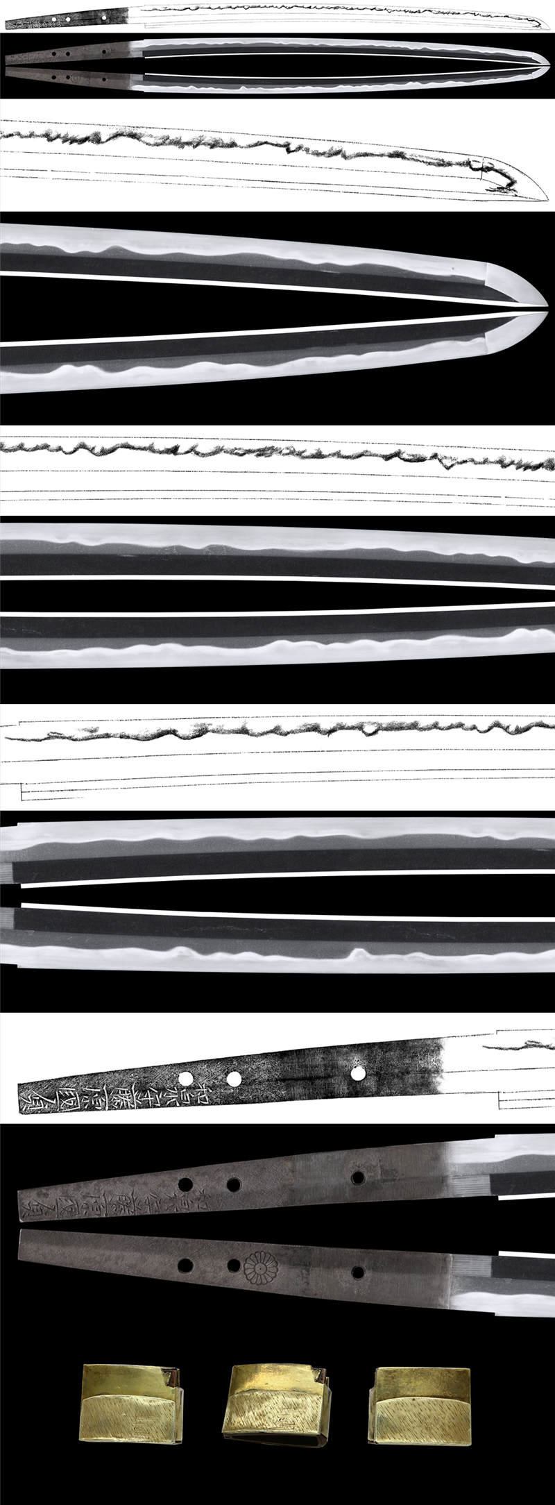 体配:身幅、重ね尋常な反りの浅い刀で3寸程の区送、摺上られた作品で茎には銘が完全に残る。 茎の〈裏に菊紋を彫りが後刻と考えられる。
