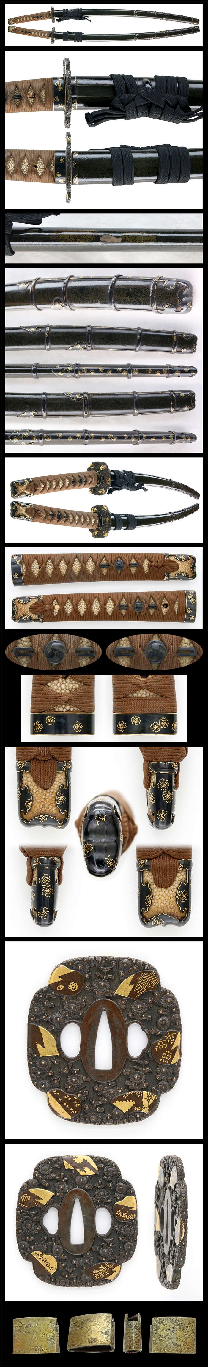 鍔:木爪型赤銅地に菊の花と扇面を高彫りし金の色絵をほどこす。
