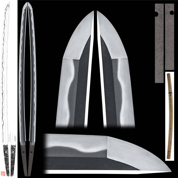 介绍:铃木家贺寿贞则是著名刀工井上真改的弟子,本国肥后菊池,通称佐右卫门,进入大阪之后拜入初代国贞的门下,成为内藤加的刀工之后移居磐城。广义上来说,由于是井上真改的弟子,在地铁和刃文的呈现上与真改极为相似。