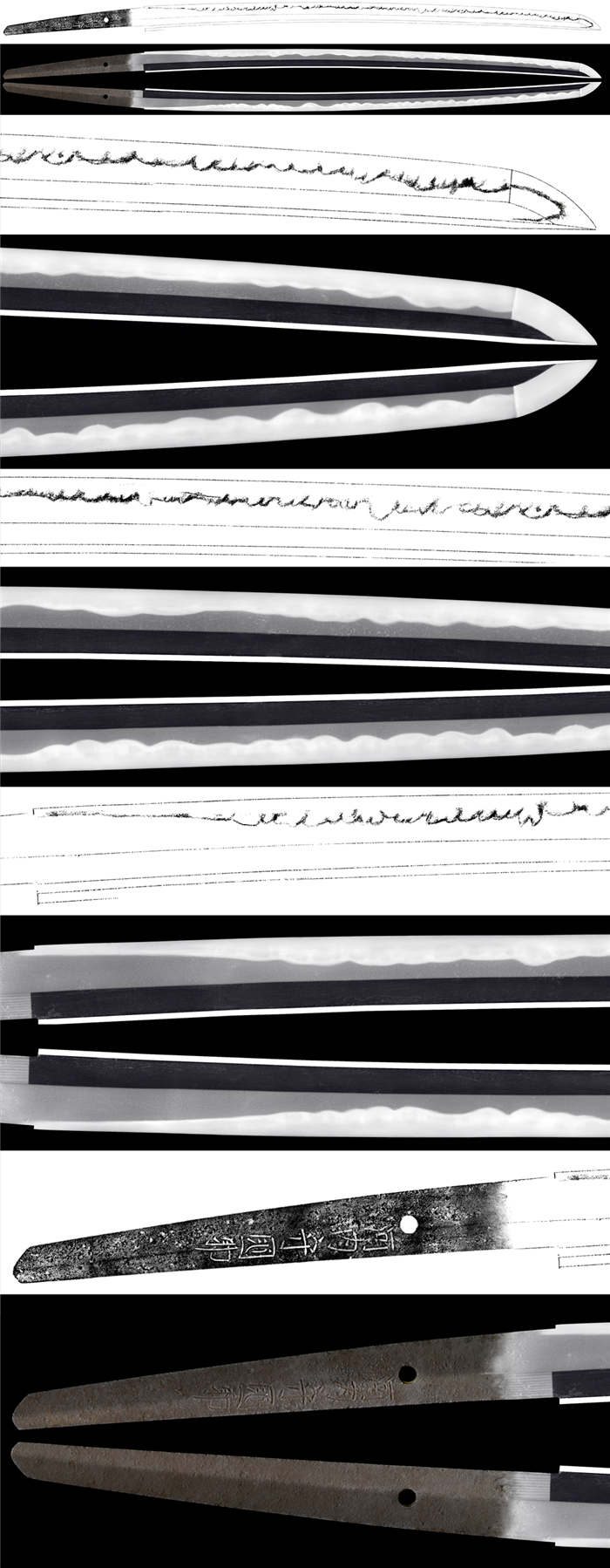 刃文:刃区直刃,刃先互目乱混丁字乱,足良入,拳丁字乱加湾,刃中砂流金筋动。