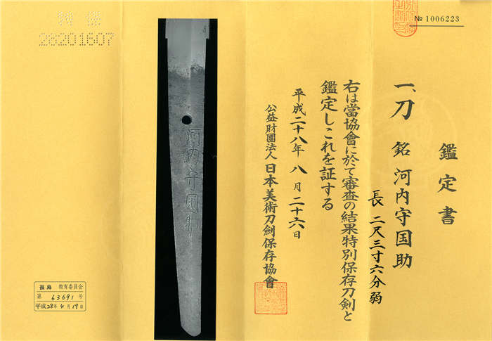 特徴:本作は二代河内守國助によ刀である。二代河内守国助は初代と三代に挟まれている所から