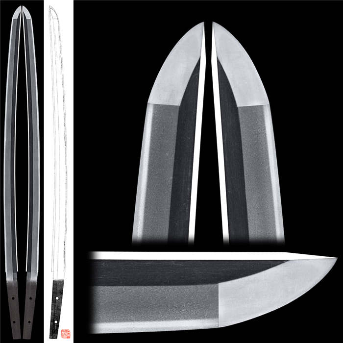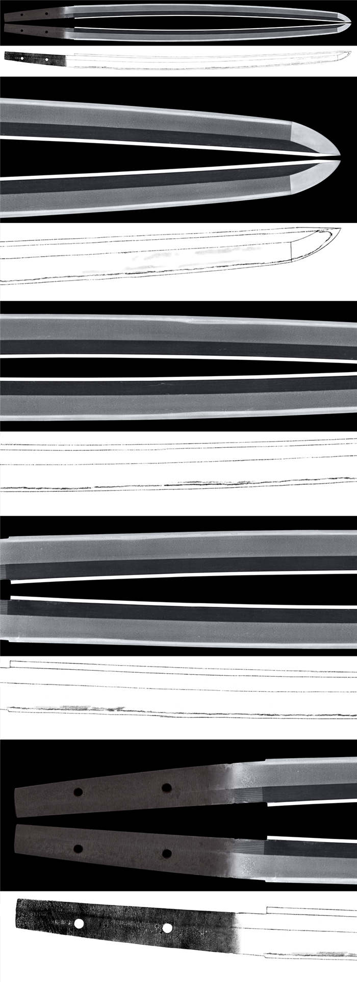 体配:刀身较短,身幅、元重寻常,切先长,刀姿康健的大磨上无铭作品。
