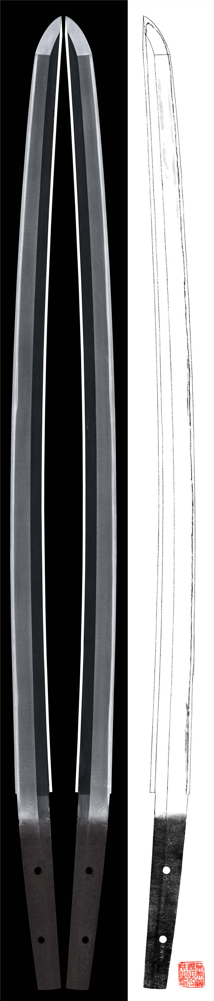 刃紋:錵出来直刃、二重刃が混じり地には映りが表れ帽子丸く返る。