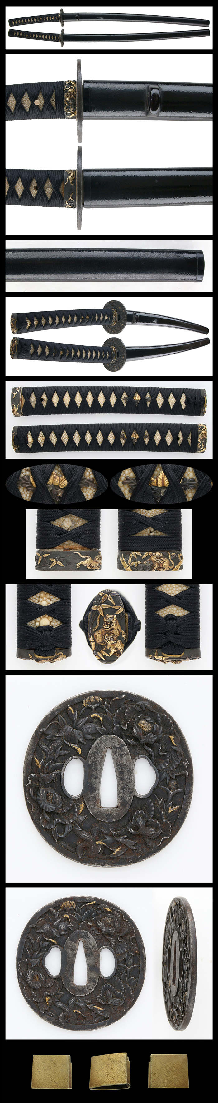 縁頭:赤銅魚子地に虎と竹を高彫りし金の色絵をほどこす。
